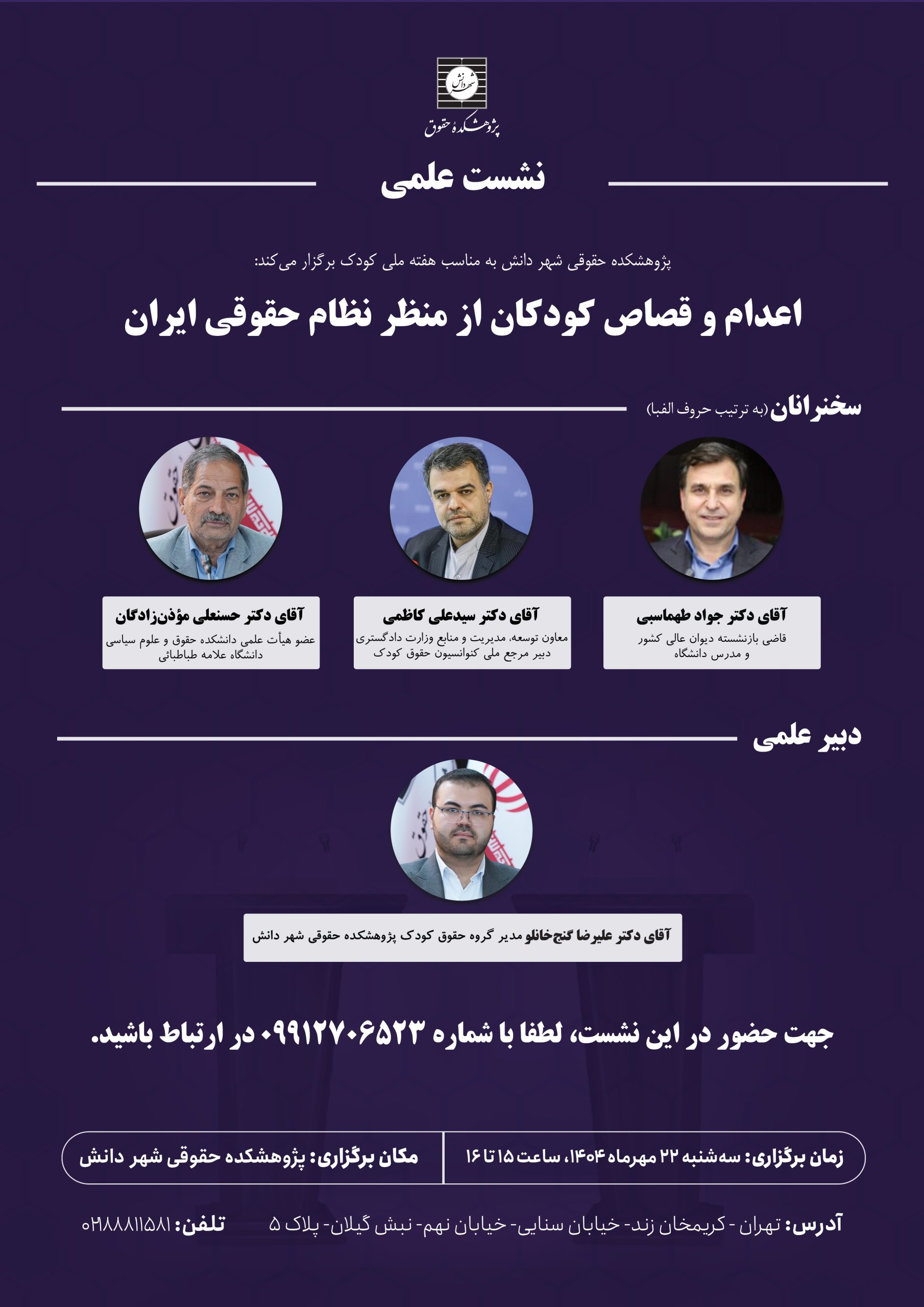 پژوهشکده حقوقی شهردانش به مناسب هفته ملی کودک نشست علمی « اعدام و قصاص کودکان از منظر نظام حقوقی ایران» را برگزار میکند