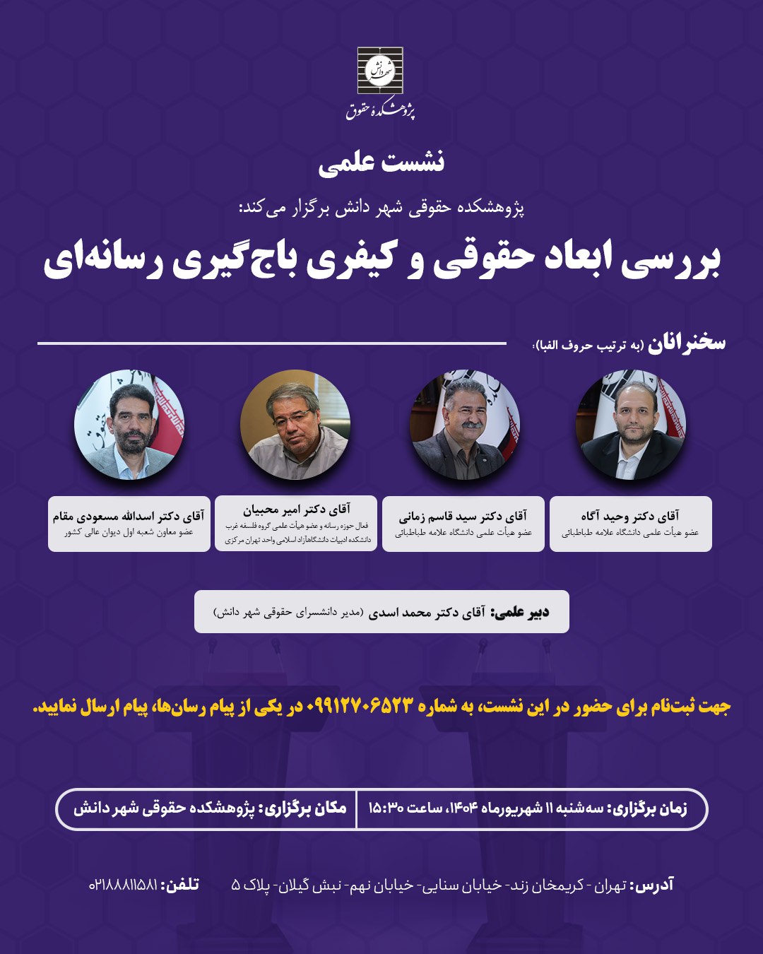 پژوهشکده حقوقی شهردانش نشست علمی بررسی ابعاد حقوقی باجگیری رسانهای را با حضور دکتر وحید اشتیاق برگزار میکند: