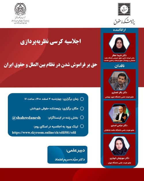روز چهارشنبه مورخ 1400/12/04 پژوهشکده حقوقی شهردانش با استعانت از پروردگار متعال، کرسی نظریهپردازی با عنوان «حق بر فراموششدن در نظام بینالملل و حقوق ایران» را برگزار نمود. این جلسه رأس ساعت 16 آغاز شد.